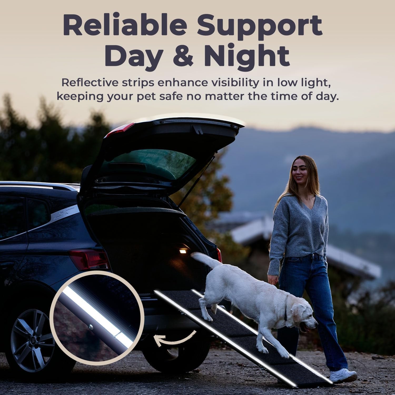 • ❰❰ Reflective Safety for Night Use ❱❱ Designed for safety, this dog car ramp features reflective strips that enhance visibility in low light, making it perfect for nighttime or early morning use. Whether using it as a dog ramp for SUVs, trucks, or high beds, the reflective safety design helps guide your pet with confidence.