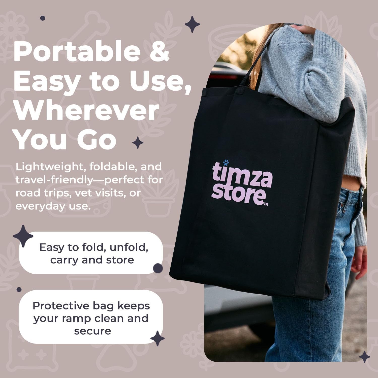 Make traveling with your pet easier with this folding dog ramp, designed for cars, SUVs, trucks, stairs, and high beds. Whether you need a dog ramp for car side doors, truck beds, or porch steps, this portable dog ramp ensures a smooth and comfortable climb for dogs of all sizes, including large breeds. Built with durable aluminum, this dog ramp for large dogs supports up to 250 lbs, providing a stable and slip-resistant surface that’s ideal for older pets or dogs with mobility challenges. The textured felt rug enhances grip, making it an excellent choice for dog ramps for stairs, SUVs, and beds. Additionally, reflective strips improve visibility, making this a reliable dog car ramp for nighttime use. Thanks to its quad-fold design, this collapsible dog ramp for cars folds down to just 5.5 inches, making it easy to store and transport. At only 13.5 lbs, it’s lightweight yet sturdy, perfect for helping dogs get into cars, trucks, and high surfaces. The included carry bag allows for hassle-free portability, whether you're at home or on the go. Versatile and user-friendly, this ramp for dogs works great as a dog ramp for beds, couches, and stairs, offering a practical solution for pet owners looking to provide easier access for their furry companions. Whether you need a dog ramp for SUVs, trucks, or porches, this dog stair ramp combines functionality, durability, and convenience.